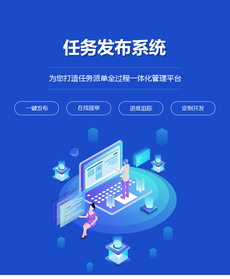 线任务发布系统,适用于中小企业、创业团队及个人的使用的任务派单管理工具,是从任务一键发布、实时派单、在线接单、进度上报、进度查询、客户评价一站式的互联网解决方案,帮助企业/团队/个人提高管理效率、掌握及时、准确、全面的任务进度,有效控制任务实施全过程。